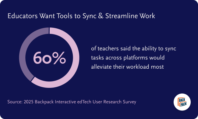 In fact, a majority of teachers who responded to our survey (60%) cited the ability to “sync” tasks, like providing students from multiple classes the same assignment at once, as the product capability that would most streamline their workload.