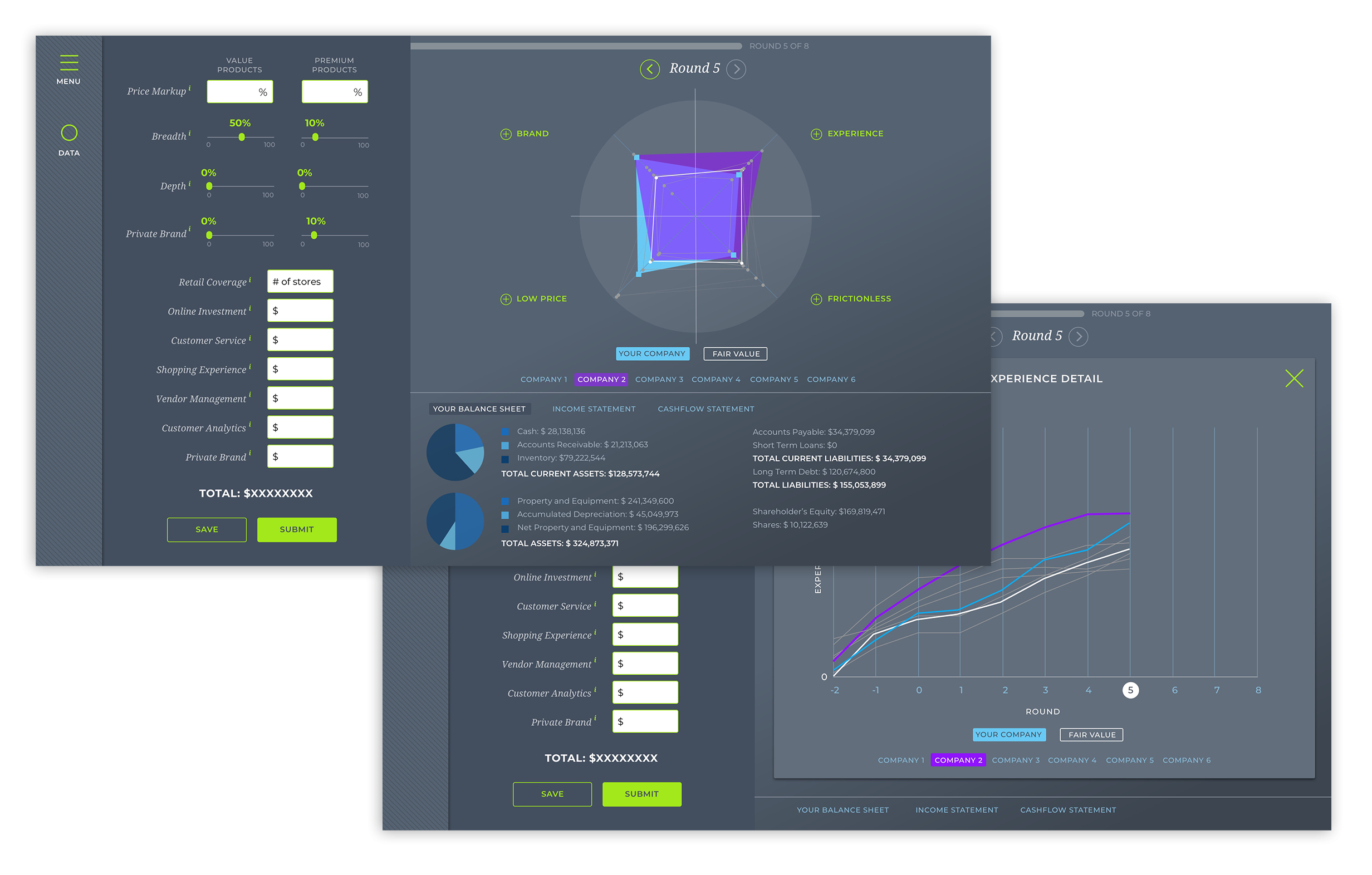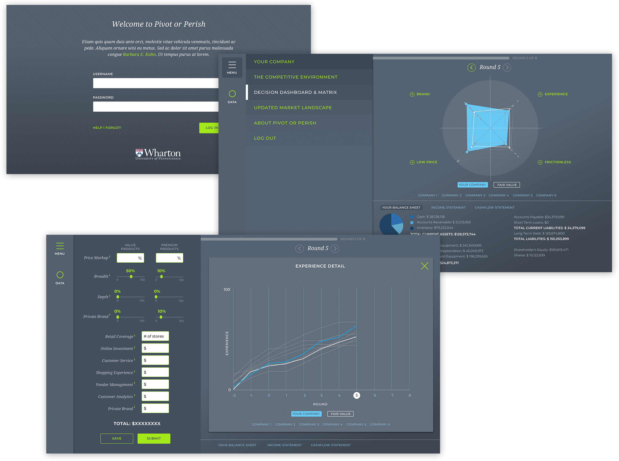 Pivot or Perish was an opportunity to tell the story of what a company could be as well as what challenges brick and mortar stores face in the 21st century. We built a visual UI that allows a user to see what impact their marketing decisions made to their mock business across multiple rounds of gameplay. Quick toggling between screens allows the user to dive into more details, displaying the data in slick, clean graphs and visualizations. The end result is an engaging, interactive way to teach the nuances of the consumer market.